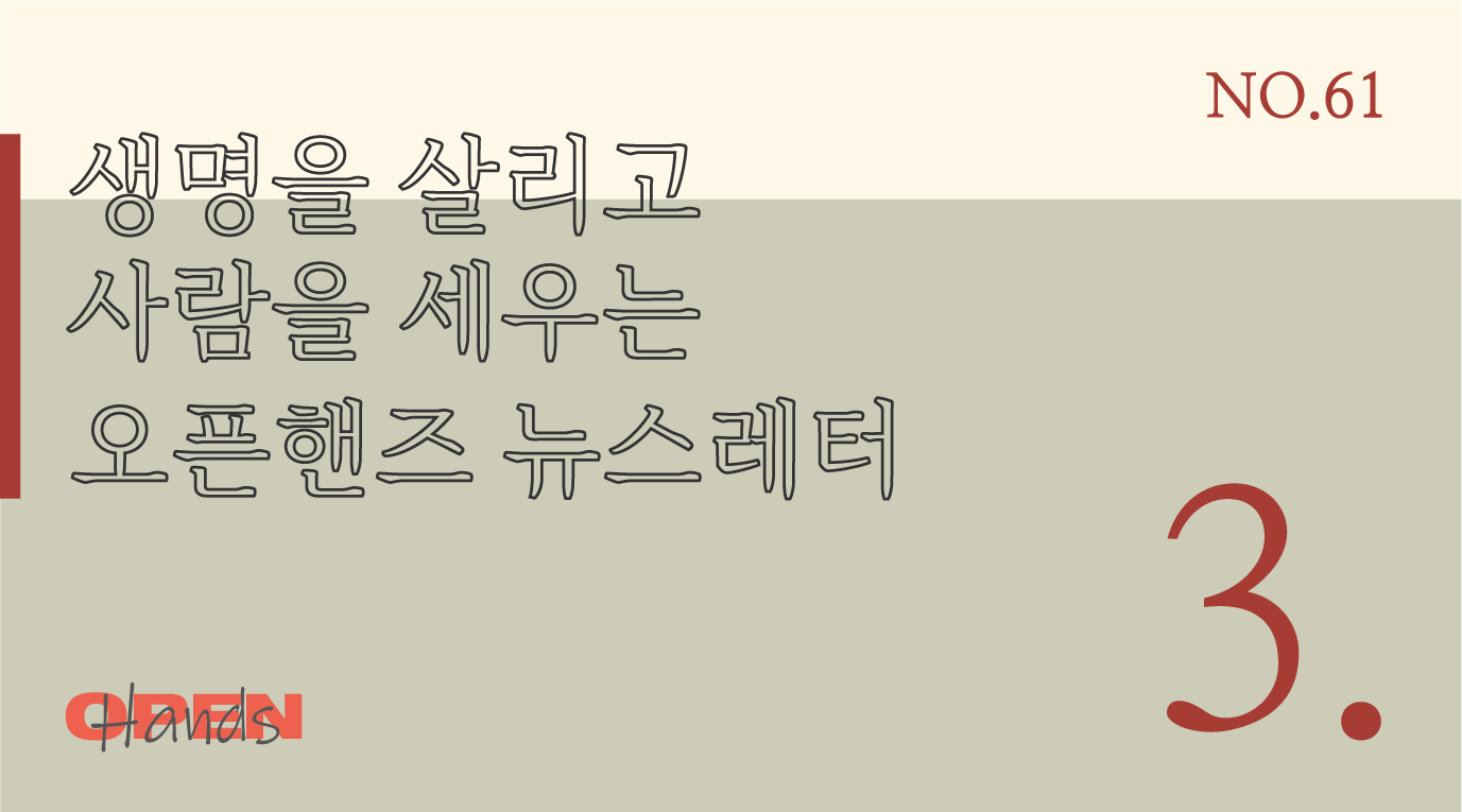 어느 임상심리학자는 ‘사람은 타인과 끊임없이 대화하면서 마음의 질서를 유지한다’고 말합니다. 가까이 혹은 멀리, 발견되는 문제들의 간극을 ‘다양한 대화’로 풀어나가기를 희망합니다. 우리의 대화가 한 생명을 살리는 소중한 시작점이 될 것입니다. 후원자님과의 더욱 다양한 대화를 기대하며 3월의 뉴스레터를 시작합니다.💌